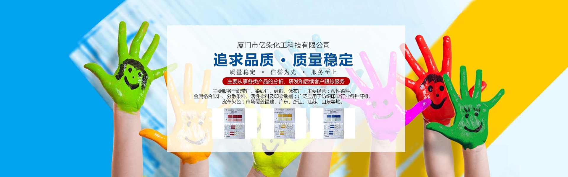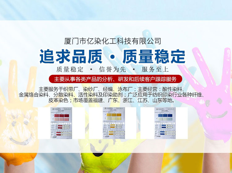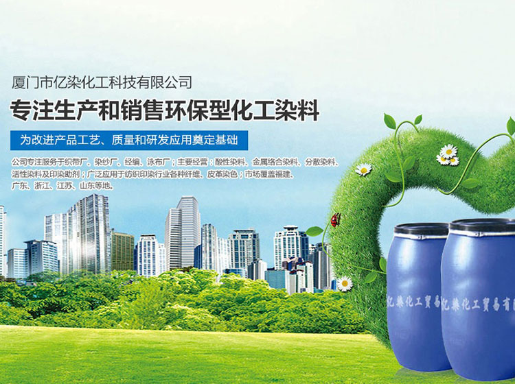 廈門市億染化工科技有限公司是一家集研發(fā)、生產、銷售一體的綜合型企業。公司主要經營:酸性染料、金屬絡合染料、高牢度分散染料及印染助劑。公司信守“以誠信贏合作、以質量贏市場、以創新贏發(fā)展、以服務贏生存”的企業精神服務于廣大客戶,多年以來建立了良好的市場口碑,市場遍布福建、廣東、浙江、江蘇、山東及東南亞國家,與多家知名企業建立了長期合作伙伴關系!